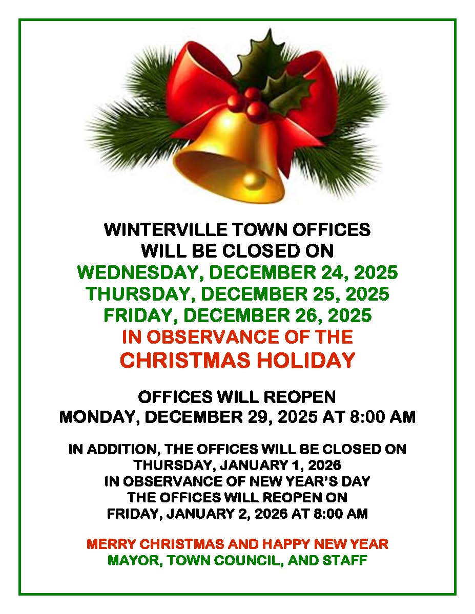 Holiday Closings: Town of Winterville offices will be closed on December 24th, 25th, 26th, and January 1st. No inspections will be conducted on these dates.