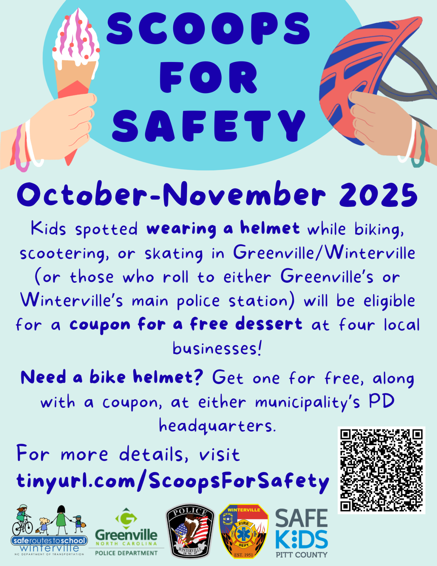 Time to get active and rolling — K-12 kids seen wearing their helmets while biking, scootering, and skating during October and November will be eligible for a sweet treat! Winterville and Greenville law enforcement/emergency personnel will be handing out coupons redeemable for free desserts at local businesses to children seen wearing helmets around trails, neighborhoods, going to/from school, or those who roll to participating stations. Need a helmet? Children can get one for free from participating police stations, along with a dessert coupon. For guidelines, participating businesses, and more, visit https://tinyurl.com/ScoopForSafety