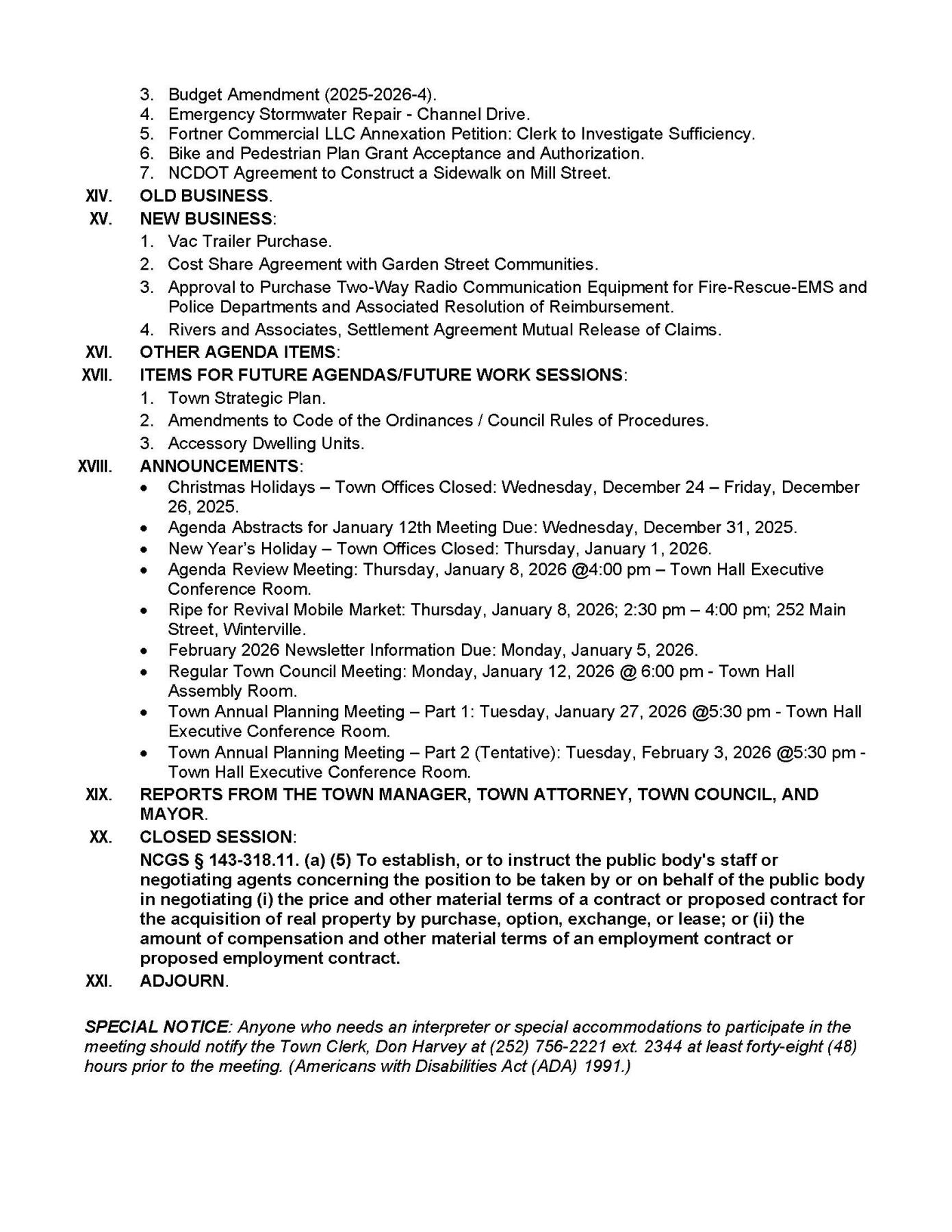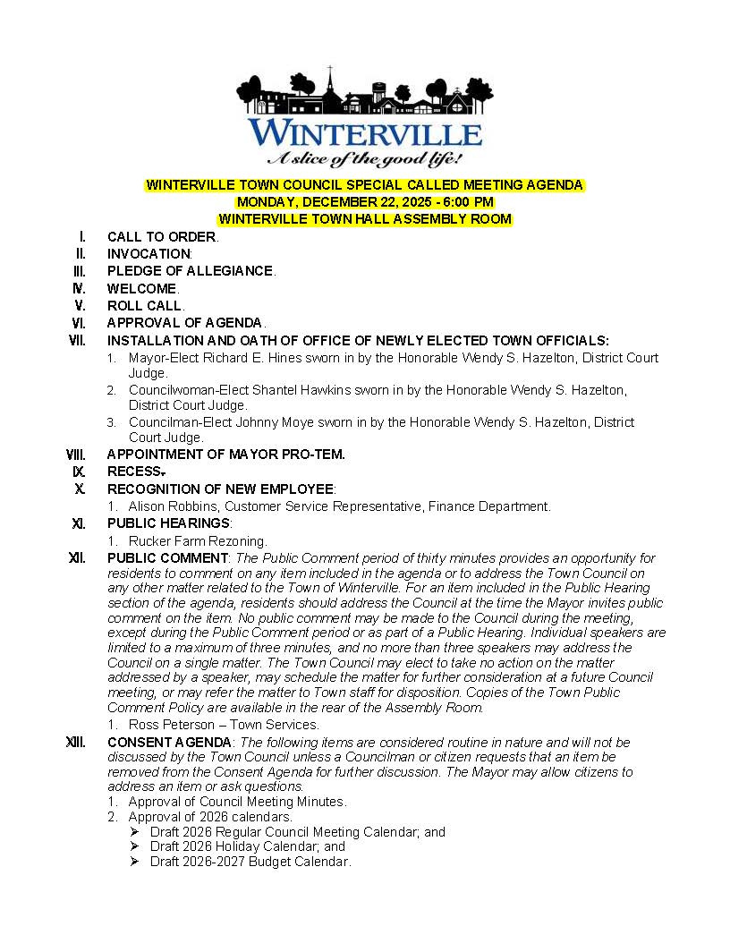 WINTERVILLE TOWN COUNCIL SPECIAL CALLED MEETING AGENDA